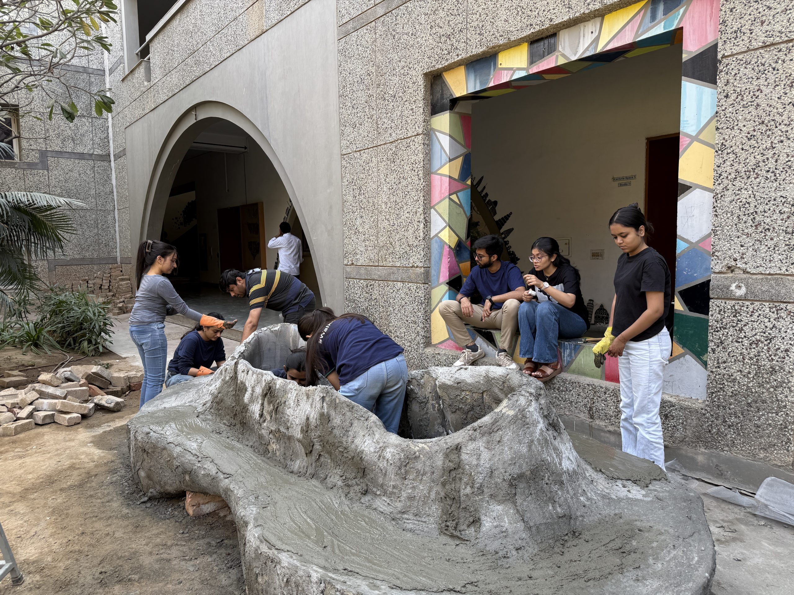 The installations seamlessly merged academic knowledge with hands-on experimentation, providing a dynamic platform for students to explore structure, materials, and technology. These were divided into two categories: Service-based installations and Art-based installations. The service-based installations were faculty-led with 3rd-year participation, featuring a Sample washroom showcasing plumbing and anthropometric details (with fixtures sponsored by Jaquar), Motion sensor-based lights, Acoustic materials, HVAC working models, and Solar lighting. The art-based installations explored various materials following the “Pixelated” theme, including Bamboo seating, Northern lights, a Kinetic installation, a Pixel cloud, and a Puzzle using wooden boards. Notable thematic works also included the Kavitra backdrop (deconstructed narratives), an Auditorium backdrop, Seating using ferro-cement, and Modular furniture from waste.